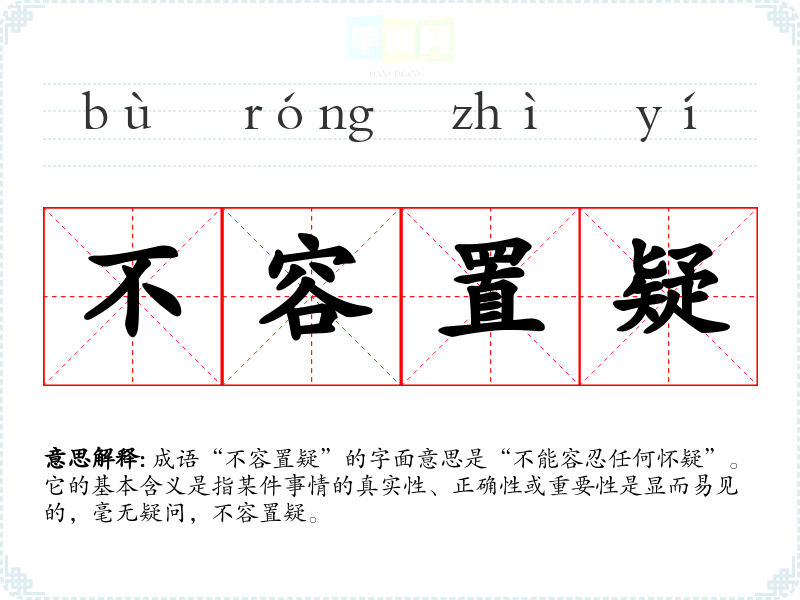 成语“不容置疑”的字面意思是“不能容忍任何怀疑”。它的基本含义是指某件事情的真实性、正确性或重要性是显而易见的,毫无疑问,不容置疑。