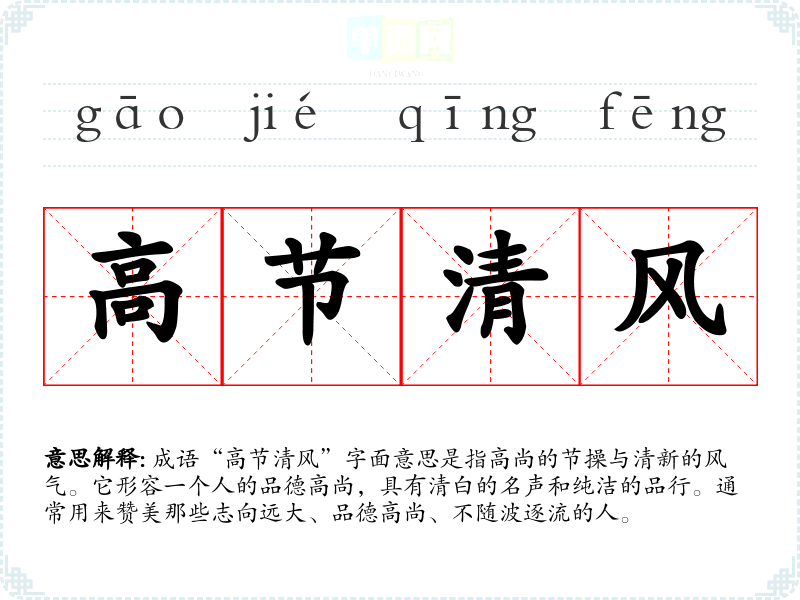 成语“高节清风”字面意思是指高尚的节操与清新的风气。它形容一个人的品德高尚,具有清白的名声和纯洁的品行。通常用来赞美那些志向远大、品德高尚、不随波逐流的人。