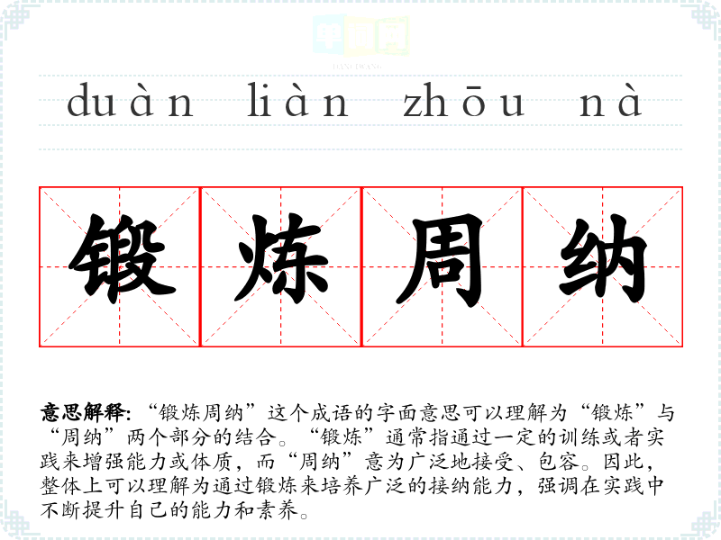 “锻炼周纳”并不是一个传统的成语,可能是由现代人创造的词汇表达。它可能受到了古代成语的影响,例如“锻炼”与“包容”的结合,反映了现代社会对能力和素养提升的重视。