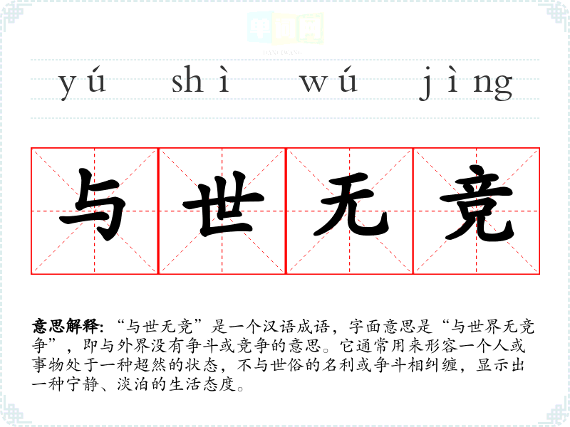 | 与世无竞 | 世:世人,周围的人。不跟社会上的人竞争。这是一种消极的回避矛盾的处世态度。 |