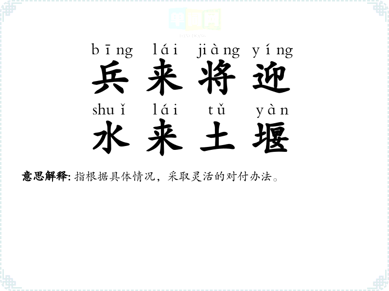 | 兵来将迎,水来土堰 | 指根据具体情况,采取灵活的对付办法。 |