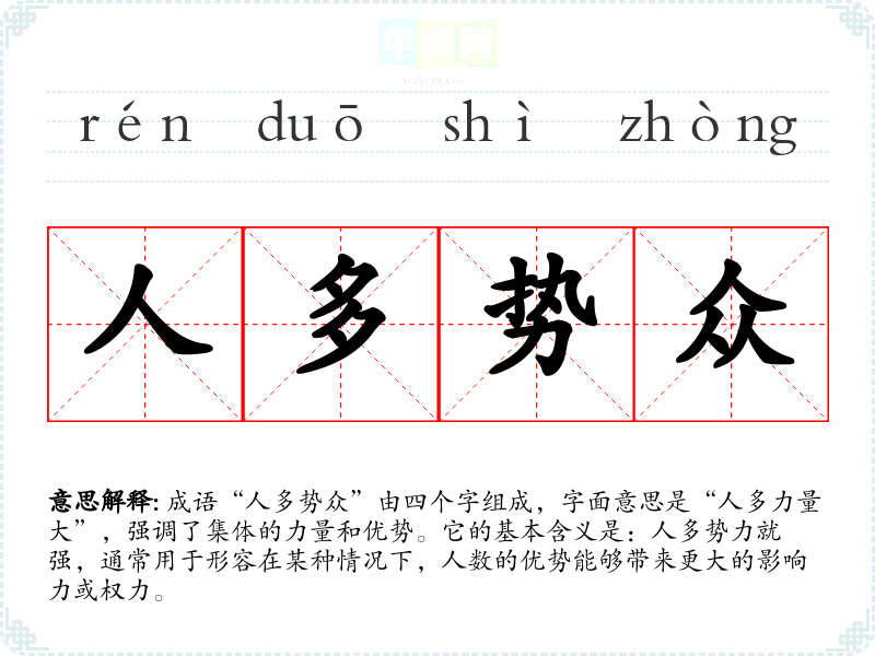 成语“人多势众”由四个字组成,字面意思是“人多力量大”,强调了集体的力量和优势。它的基本含义是:人多势力就强,通常用于形容在某种情况下,人数的优势能够带来更大的影响力或权力。