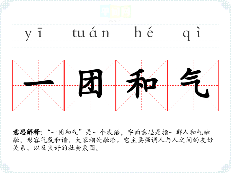 “一团和气”是一个成语,字面意思是指一群人和气融融,形容气氛和谐,大家相处融洽。它主要强调人与人之间的友好关系,以及良好的社会氛围。