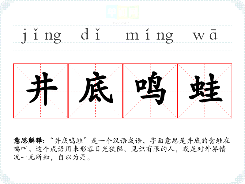 “井底鸣蛙”是一个汉语成语,字面意思是井底的青蛙在鸣叫。这个成语用来形容目光狭隘、见识有限的人,或是对外界情况一无所知,自以为是。