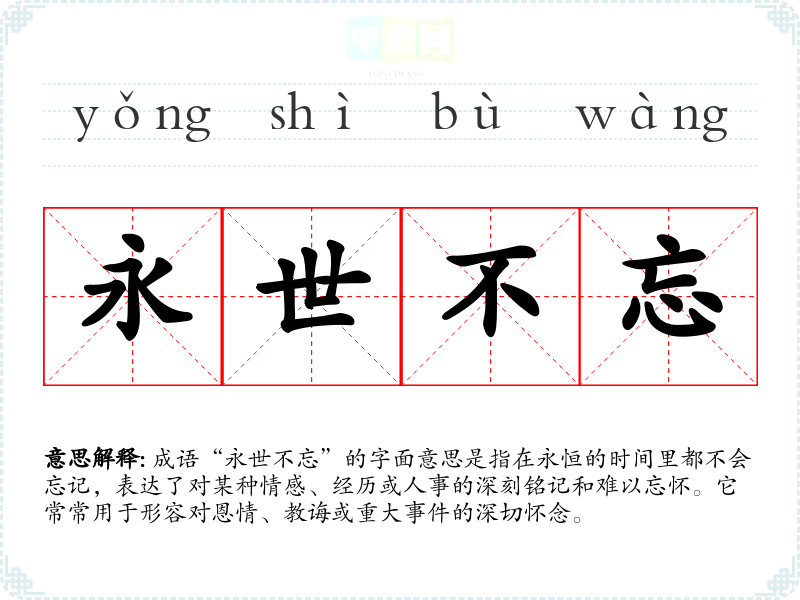 | 永世不忘 | 永世:无穷尽的世代。终身铭记在心,永不忘怀。 |