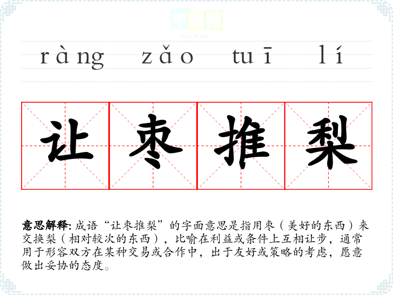 成语“让枣推梨”的字面意思是指用枣(美好的东西)来交换梨(相对较次的东西),比喻在利益或条件上互相让步,通常用于形容双方在某种交易或合作中,出于友好或策略的考虑,愿意做出妥协的态度。