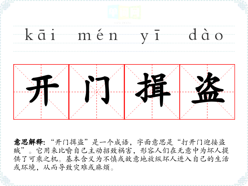 | 开门延盗 | 开门请强盗进来。比喻引进坏人,招来祸患。同“开门揖盗”。 |