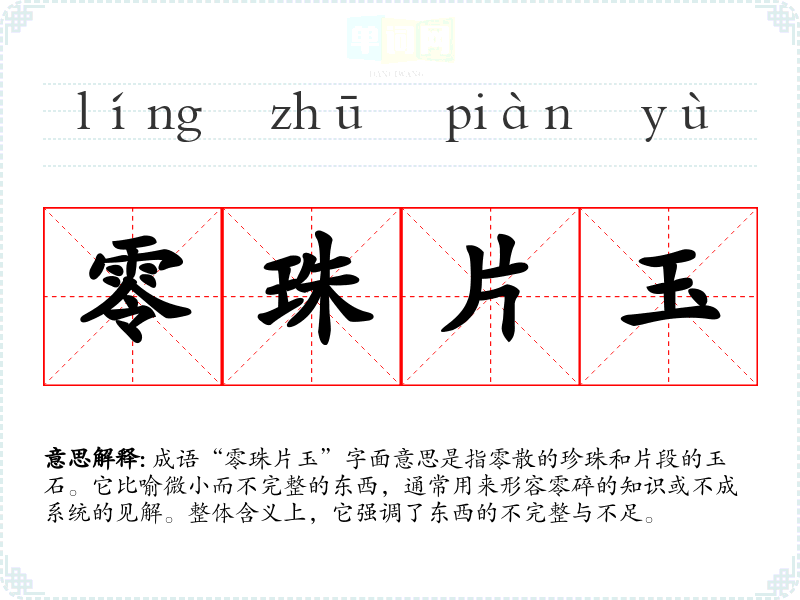 成语“零珠片玉”字面意思是指零散的珍珠和片段的玉石。它比喻微小而不完整的东西,通常用来形容零碎的知识或不成系统的见解。整体含义上,它强调了东西的不完整与不足。