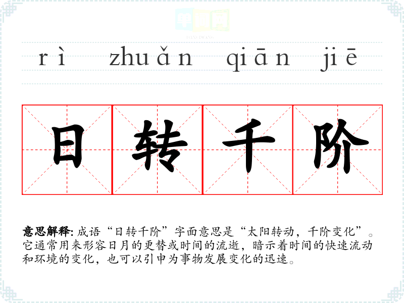 成语“日转千阶”字面意思是“太阳转动,千阶变化”。它通常用来形容日月的更替或时间的流逝,暗示着时间的快速流动和环境的变化,也可以引申为事物发展变化的迅速。