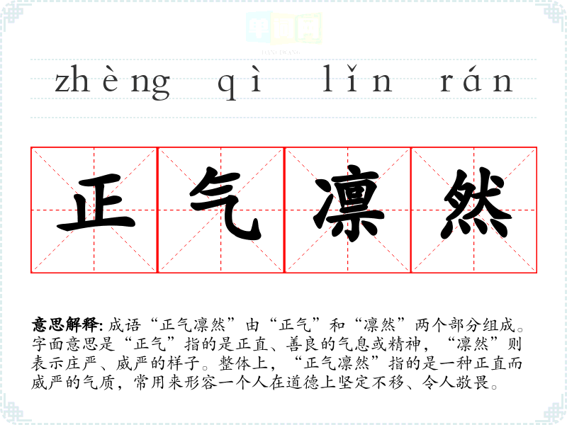 “正气凛然”给人一种庄重和正义感的联想,它能够激发人们追求真理和正义的情感,提醒我们在生活中要保持道德的坚定和尊严。