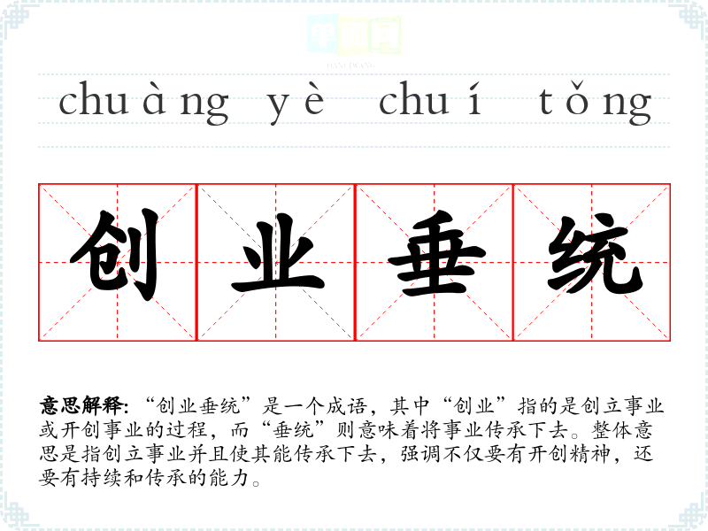 | 创业垂统 | 创业:创建功业;垂:流传;统:指一脉相承的系统。创立功业,传给后代子孙。 |
