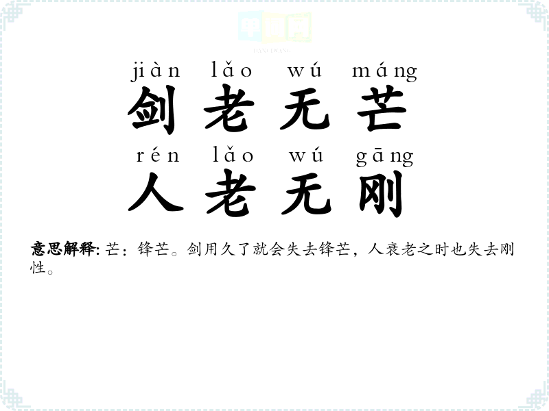 | 剑老无芒,人老无刚 | 芒:锋芒。剑用久了就会失去锋芒,人衰老之时也失去刚性。 |