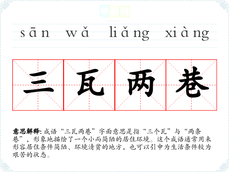 成语“三瓦两巷”字面意思是指“三个瓦”与“两条巷”,形象地描绘了一个小而简陋的居住环境。这个成语通常用来形容居住条件简陋、环境清贫的地方,也可以引申为生活条件较为艰苦的状态。