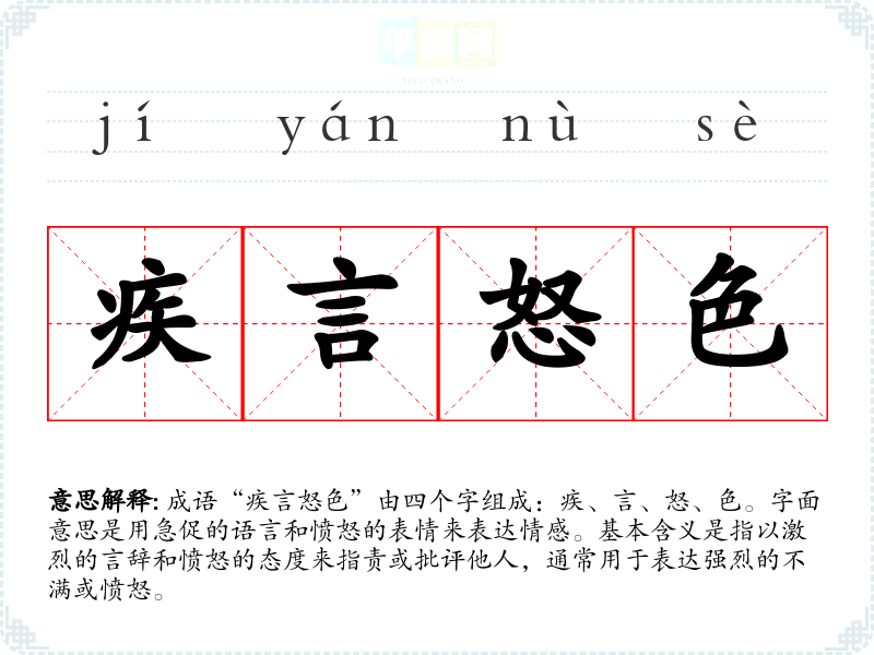 成语“疾言怒色”由四个字组成:疾、言、怒、色。字面意思是用急促的语言和愤怒的表情来表达情感。基本含义是指以激烈的言辞和愤怒的态度来指责或批评他人,通常用于表达强烈的不满或愤怒。