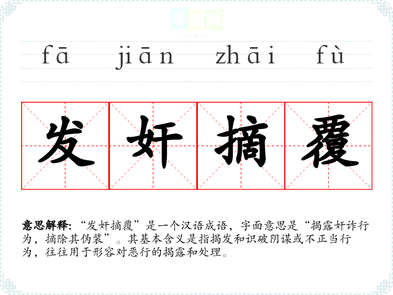 “发奸摘覆”是一个汉语成语,字面意思是“揭露奸诈行为,摘除其伪装”。其基本含义是指揭发和识破阴谋或不正当行为,往往用于形容对恶行的揭露和处理。