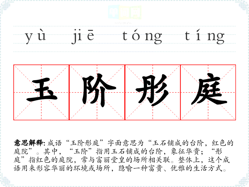 成语“玉阶彤庭”字面意思为“玉石铺成的台阶,红色的庭院”。其中,“玉阶”指用玉石铺成的台阶,象征华贵;“彤庭”指红色的庭院,常与富丽堂皇的场所相关联。整体上,这个成语用来形容华丽的环境或场所,隐喻一种富贵、优雅的生活方式。