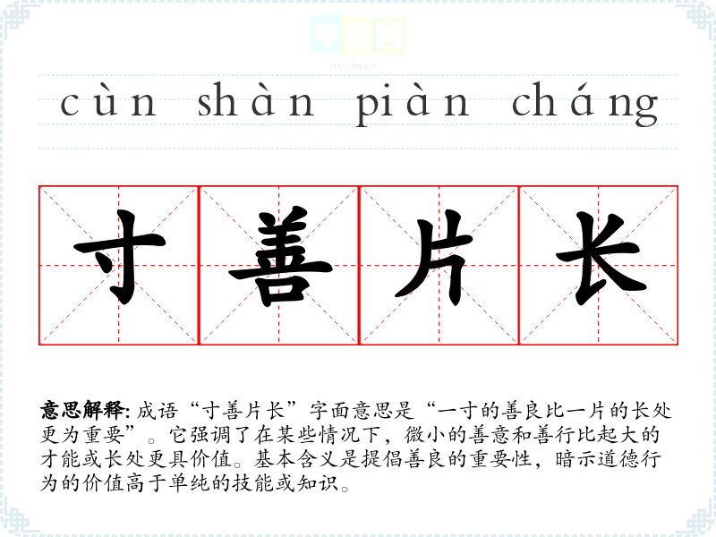 成语“寸善片长”字面意思是“一寸的善良比一片的长处更为重要”。它强调了在某些情况下,微小的善意和善行比起大的才能或长处更具价值。基本含义是提倡善良的重要性,暗示道德行为的价值高于单纯的技能或知识。