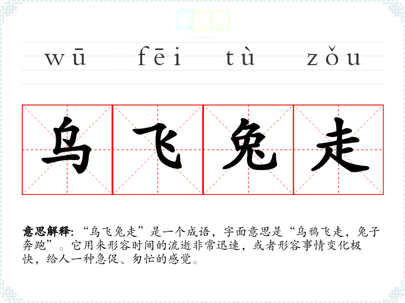 | 乌飞兔走 | 乌:古代传说日中有三足乌,故称太阳为金乌;兔:古代传说中月中有玉兔,故称月亮为玉兔。形容光阴迅速流逝。 |