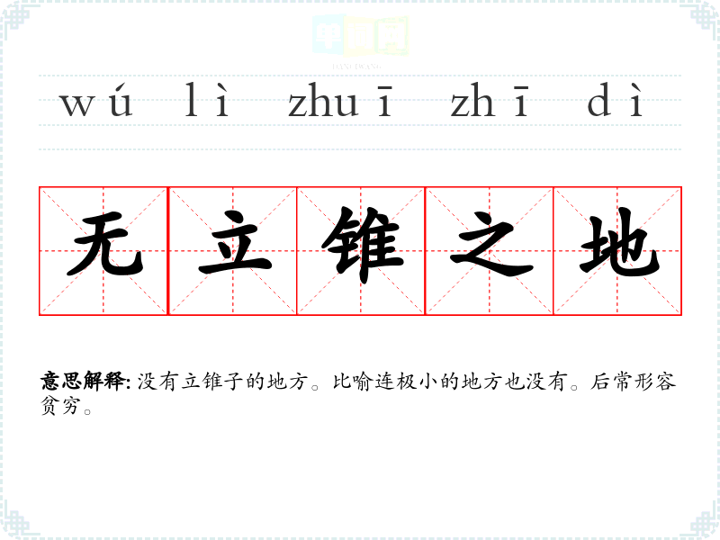 | 亡立锥之地 | 亡:无;立锥:插锥子。没有插锥尖的一点地方。形容极其贫困。 |