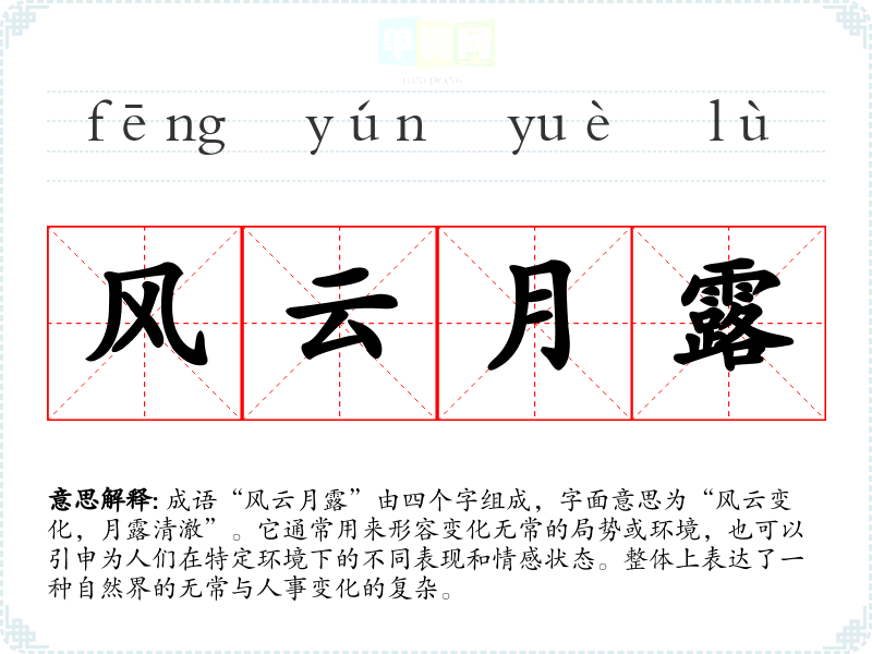 “风云月露”并无特定的文学出处,但其构成元素常出现在古代诗词中,反映自然景观与人情的变化。风与云象征了自然的变化,而月与露则代表了夜晚的宁静与清晰。成语的形成可能源于古人对自然的观察和对人事的感悟,强调了事物的多变性。
