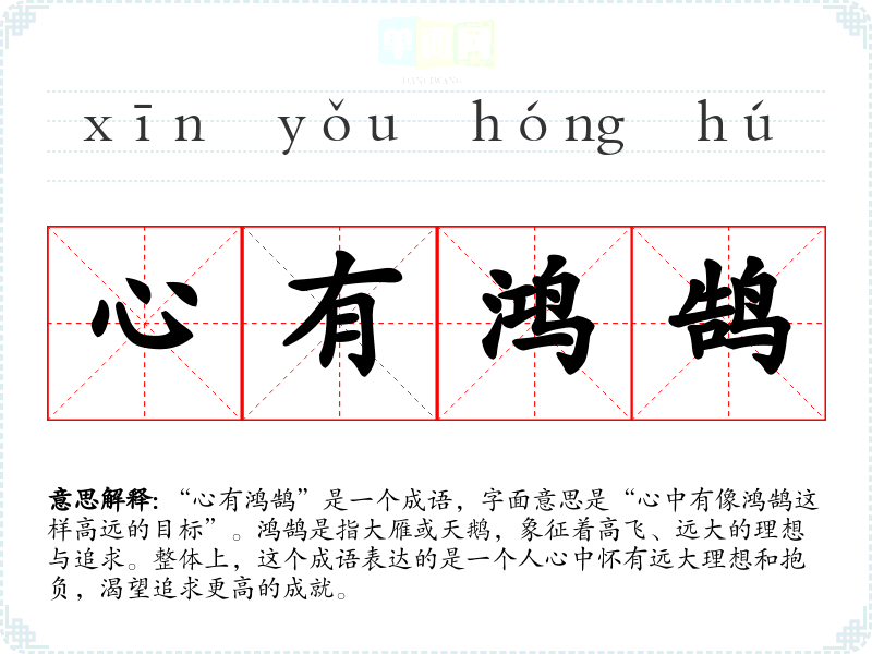 - 日常对话:可以用来鼓励朋友追求梦想,比如“你要记住,心有鸿鹄,才能飞得更高”。