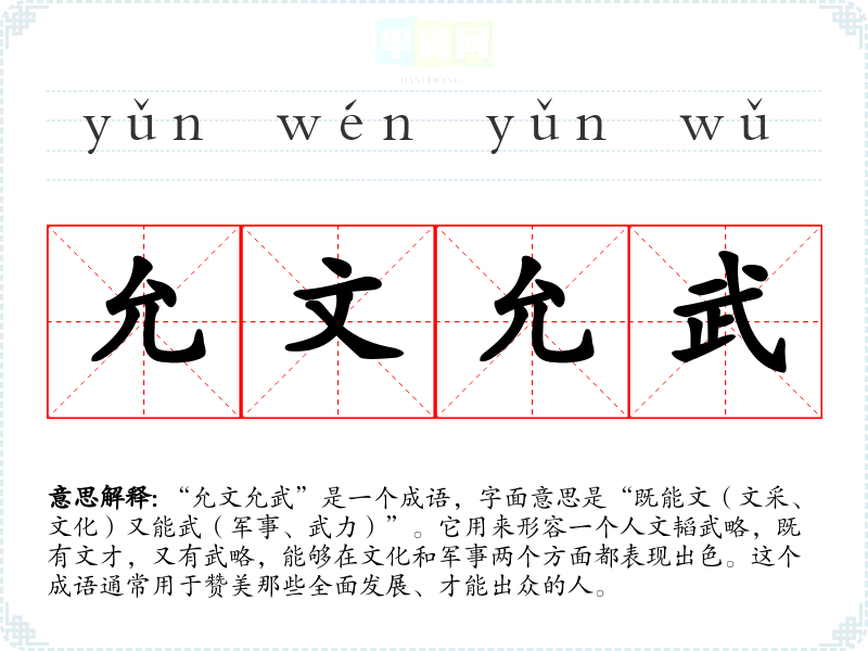 “允文允武”是一个成语,字面意思是“既能文(文采、文化)又能武(军事、武力)”。它用来形容一个人文韬武略,既有文才,又有武略,能够在文化和军事两个方面都表现出色。这个成语通常用于赞美那些全面发展、才能出众的人。
