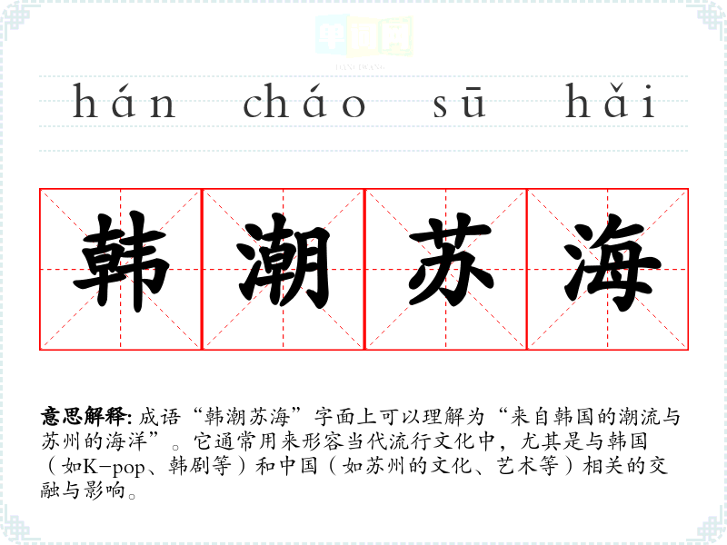 成语“韩潮苏海”字面上可以理解为“来自韩国的潮流与苏州的海洋”。它通常用来形容当代流行文化中,尤其是与韩国(如K-pop、韩剧等)和**(如苏州的文化、艺术等)相关的交融与影响。