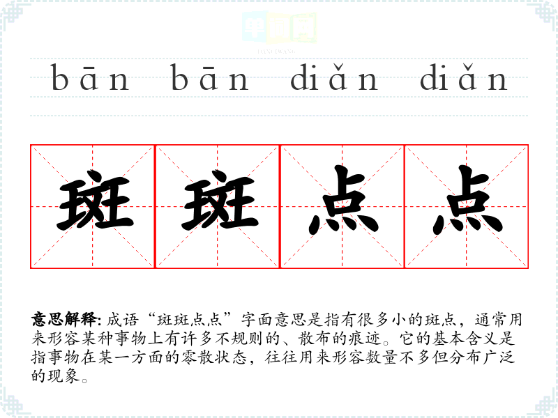 成语“斑斑点点”字面意思是指有很多小的斑点,通常用来形容某种事物上有许多不规则的、散布的痕迹。它的基本含义是指事物在某一方面的零散状态,往往用来形容数量不多但分布广泛的现象。