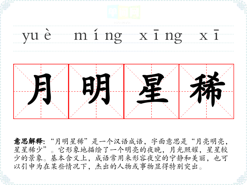 在**文化中,月亮与星星常常用来象征团圆、思念和宁静。成语“月明星稀”不仅表现了自然之美,还隐含了对美好事物的珍惜和对稀有机会的感慨。在现代社会,这个成语仍然适用,尤其是在强调个人才华或独特品质的场景中。