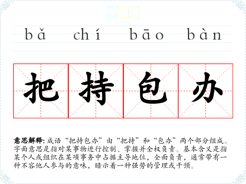 成语“把持包办”由“把持”和“包办”两个部分组成。字面意思是指对某事物进行控制、掌握并全权负责。基本含义是指某个人或组织在某项事务中占据主导地位,全面负责,通常带有一种不容他人参与的意味,暗示着一种强势的管理或干预。