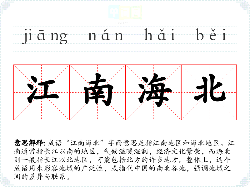 | 江南海北 | 大江之南,大海之北。形容地域广阔, |