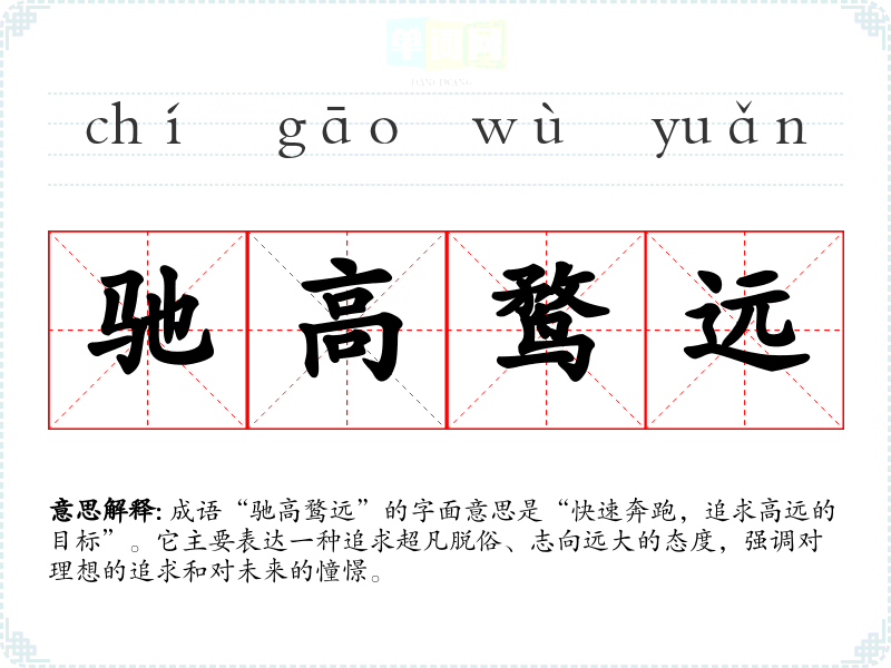 成语“驰高鹜远”的字面意思是“快速奔跑,追求高远的目标”。它主要表达一种追求超凡脱俗、志向远大的态度,强调对理想的追求和对未来的憧憬。