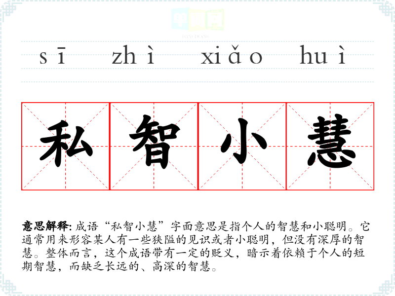 | 私智小慧 | 私:个人的;慧:智慧。个人的智慧和小聪明。指带有片面性而又自以为是的聪明。 |
