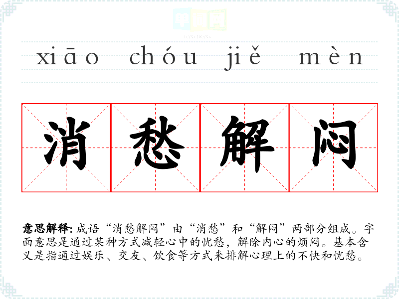 | 消愁解闷 | 消除忧愁,解除烦闷。 |