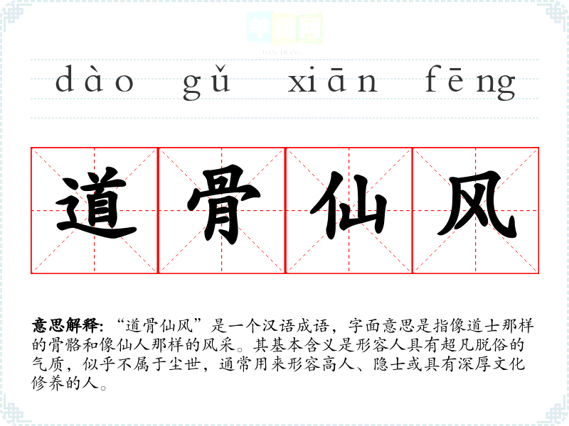 “道骨仙风”是一个汉语成语,字面意思是指像道士那样的骨骼和像仙人那样的风采。其基本含义是形容人具有超凡脱俗的气质,似乎不属于尘世,通常用来形容高人、隐士或具有深厚文化修养的人。