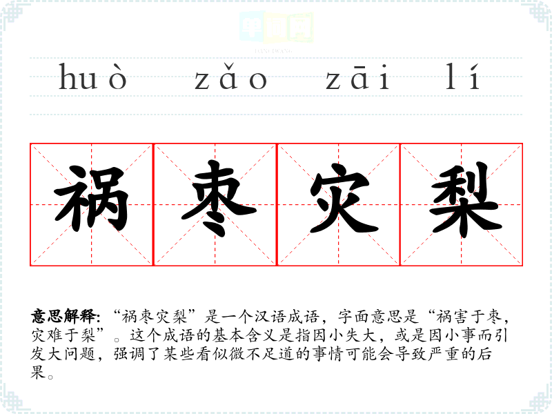 “祸枣灾梨”是一个汉语成语,字面意思是“祸害于枣,灾难于梨”。这个成语的基本含义是指因小失大,或是因小事而引发大问题,强调了某些看似微不足道的事情可能会导致严重的后果。