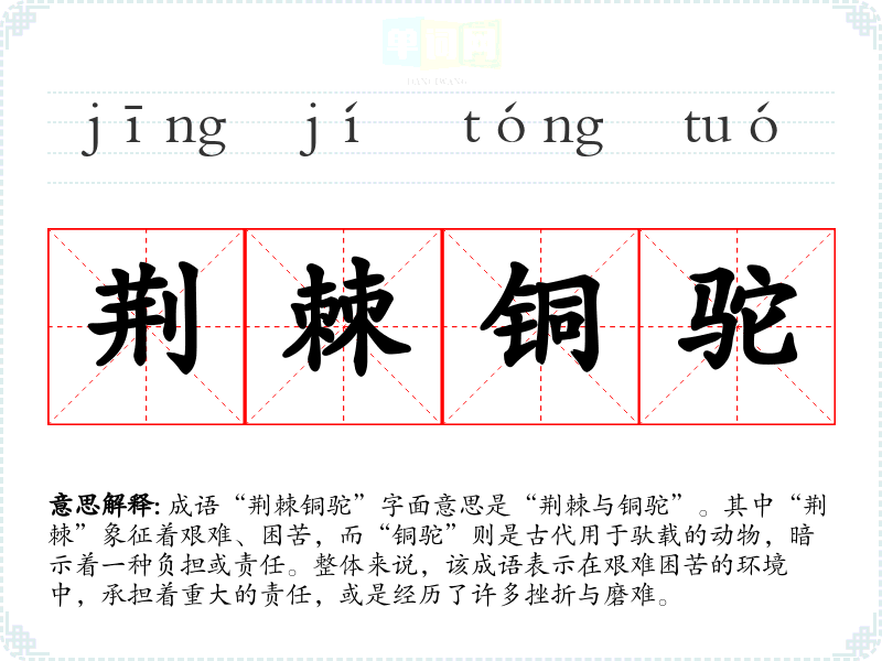 成语“荆棘铜驼”字面意思是“荆棘与铜驼”。其中“荆棘”象征着艰难、困苦,而“铜驼”则是古代用于驮载的动物,暗示着一种负担或责任。整体来说,该成语表示在艰难困苦的环境中,承担着重大的责任,或是经历了许多挫折与磨难。