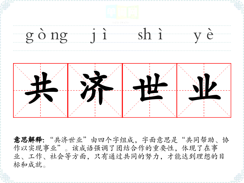 “共济世业”由四个字组成,字面意思是“共同帮助、协作以实现事业”。该成语强调了团结合作的重要性,体现了在事业、工作、社会等方面,只有通过共同的努力,才能达到理想的目标和成就。