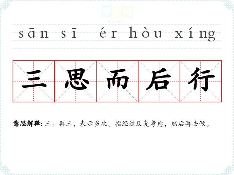 | 三思而后行 | 三:再三,表示多次。指经过反复考虑,然后再去做。 |