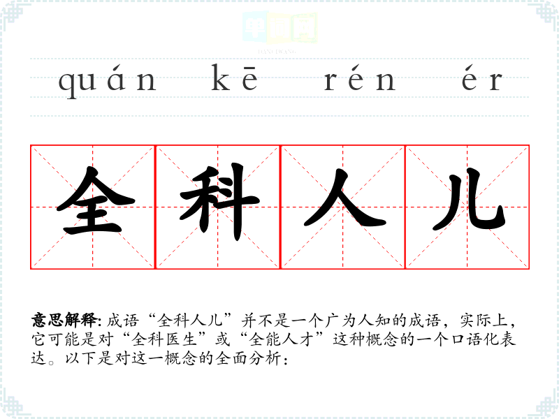 成语“全科人儿”并不是一个广为人知的成语,实际上,它可能是对“全科医生”或“全能人才”这种概念的一个口语化表达。以下是对这一概念的全面分析: