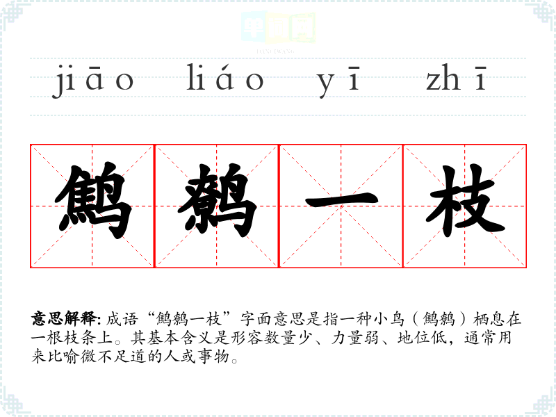 成语“鹪鹩一枝”字面意思是指一种**(鹪鹩)栖息在一根枝条上。其基本含义是形容数量少、力量弱、地位低,通常用来比喻微不足道的人或事物。