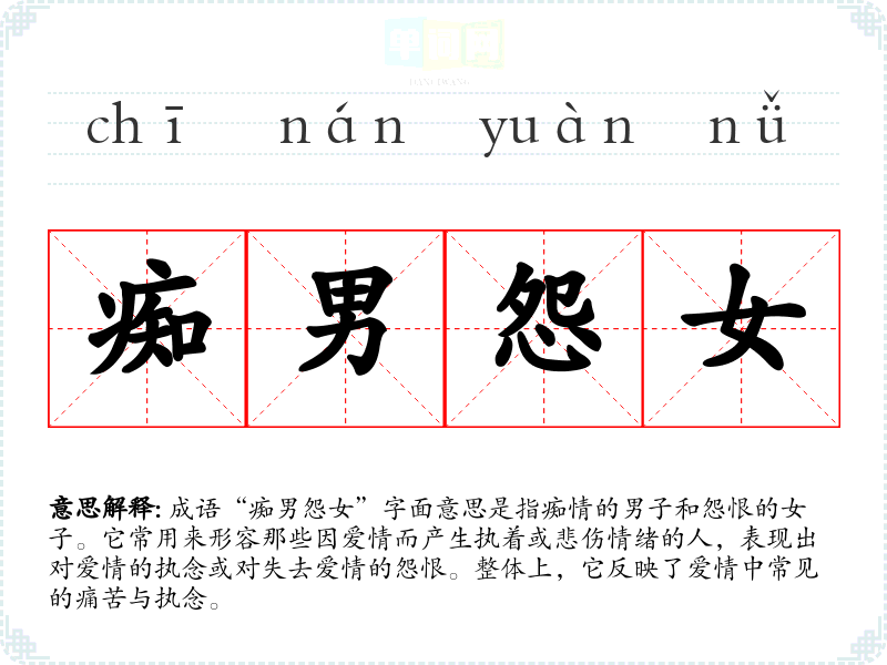 成语“痴男怨女”字面意思是指痴情的男子和怨恨的女子。它常用来形容那些因爱情而产生执着或悲伤情绪的人,表现出对爱情的执念或对失去爱情的怨恨。整体上,它反映了爱情中常见的痛苦与执念。