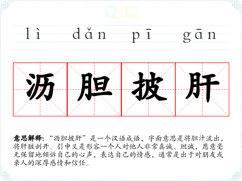 “沥胆披肝”是一个汉语成语,字面意思是将胆汁流出,将肝脏剖开。引申义是形容一个人对他人非常真诚、坦诚,愿意毫无保留地倾诉自己的心声,表达自己的情感,通常是出于对朋友或亲人的深厚感情和信任。