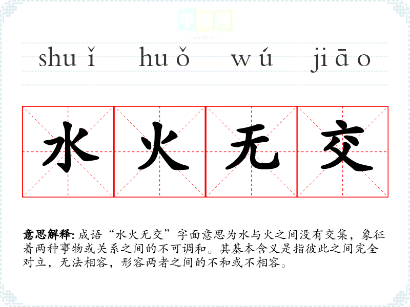 成语“水火无交”字面意思为水与火之间没有交集,象征着两种事物或关系之间的不可调和。其基本含义是指彼此之间完全对立,无法相容,形容两者之间的不和或不相容。