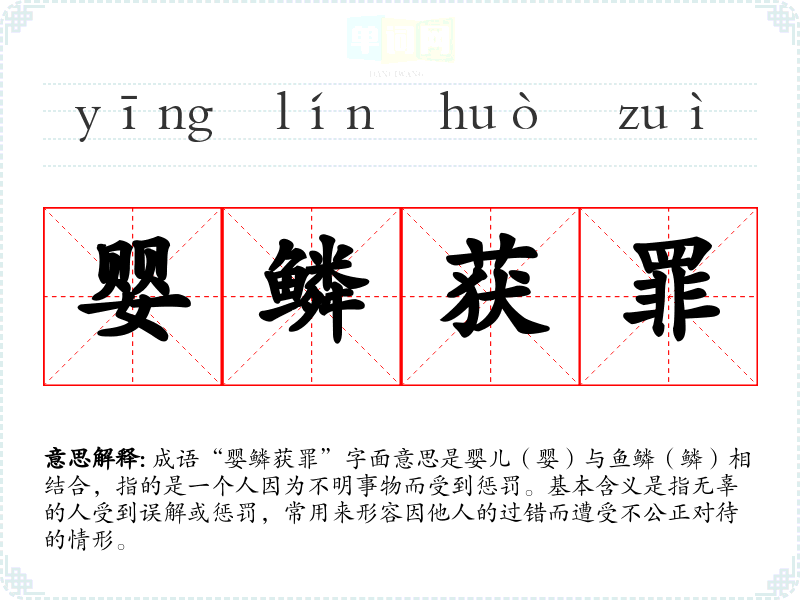 成语“婴鳞获罪”字面意思是婴儿(婴)与鱼鳞(鳞)相结合,指的是一个人因为不明事物而受到惩罚。基本含义是指无辜的人受到误解或惩罚,常用来形容因他人的过错而遭受不公正对待的情形。