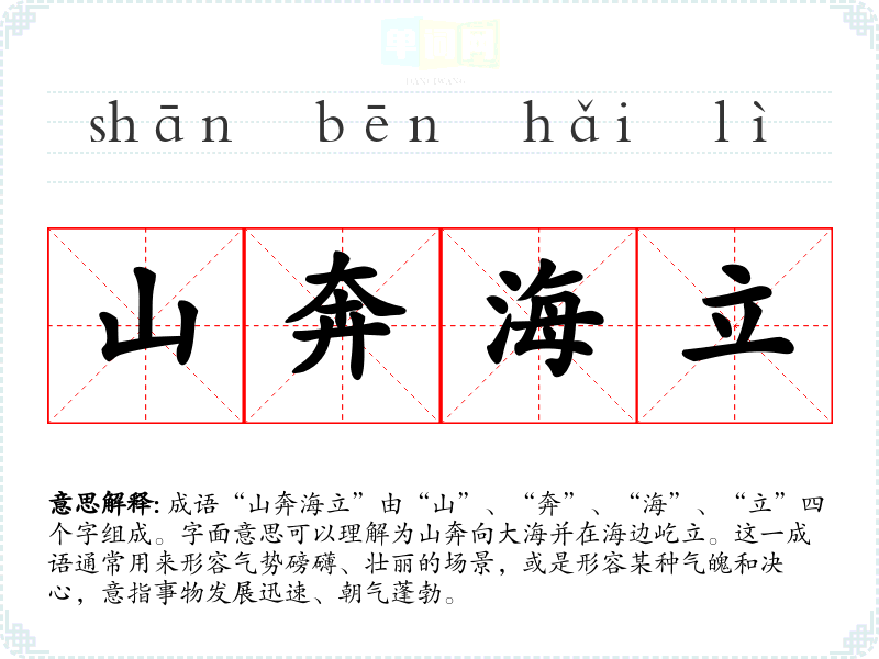 成语“山奔海立”由“山”、“奔”、“海”、“立”四个字组成。字面意思可以理解为山奔向大海并在海边屹立。这一成语通常用来形容气势磅礴、壮丽的场景,或是形容某种气魄和决心,意指事物发展迅速、朝气蓬勃。