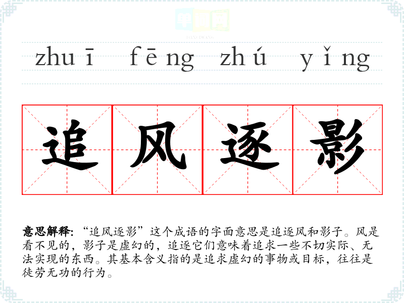 “追风逐影”这个成语的字面意思是追逐风和影子。风是看不见的,影子是虚幻的,追逐它们意味着追求一些不切实际、无法实现的东西。其基本含义指的是追求虚幻的事物或目标,往往是徒劳无功的行为。