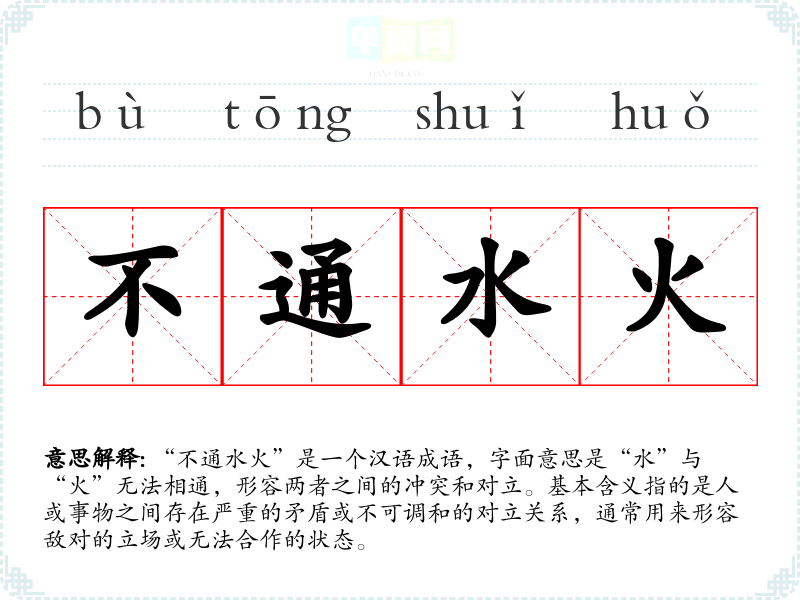 “不通水火”是一个汉语成语,字面意思是“水”与“火”无法相通,形容两者之间的冲突和对立。基本含义指的是人或事物之间存在严重的矛盾或不可调和的对立关系,通常用来形容敌对的立场或无法合作的状态。