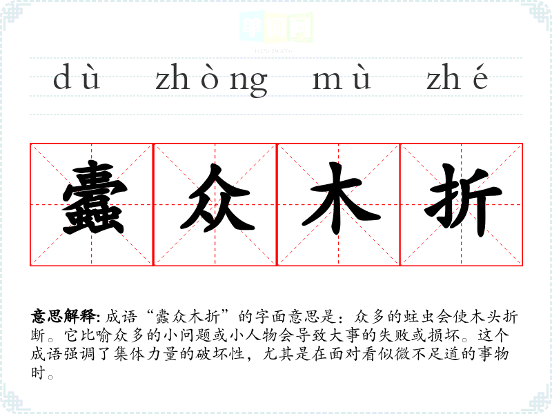 成语“蠹众木折”的字面意思是:众多的蛀虫会使木头折断。它比喻众多的小问题或小人物会导致大事的失败或损坏。这个成语强调了集体力量的破坏性,尤其是在面对看似微不足道的事物时。