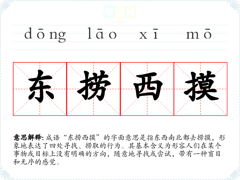 | 东捞西摸 | 指盲目地四处求索。 |
